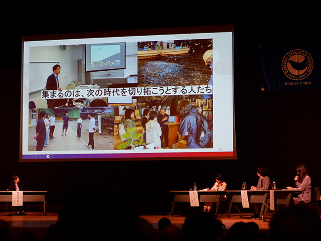 第81回日本ユネスコ運動全国大会が10月18日(土)に「『日常』能登半島の創造的復興を目指して」を大会テーマに金沢市で開催されました。会場の石川県立音楽堂邦楽ホールではオープニングイベントとしてキッズ・ジャズバンドBASICの演奏が参加者を出迎えてくれました。続いての開会式で日本ユネスコ連盟会長の佐藤美樹氏が「能登地域は昨年1月の地震、9月の豪雨で甚大な被害を受けました。全国からの支援もあり地域の多くの人達が助け合い、未来に向けて生活し活動を続けています。これはユネスコの理念でもある“持続可能な社会”とも共通するものがあります。本日はこのあとのパネルディスカッションを通じ、復旧・復興に向けての課題を共有して頂ければ幸いです」と挨拶しました。大会は「子どもたちによる伝統芸能の“能・狂言”」、「井上あずみ&ゆーゆの歌とお話コンサート」が行われ、休憩をはさんで『日常』能登半島の創造的復興をテーマにパネルディスカッションに移りました。