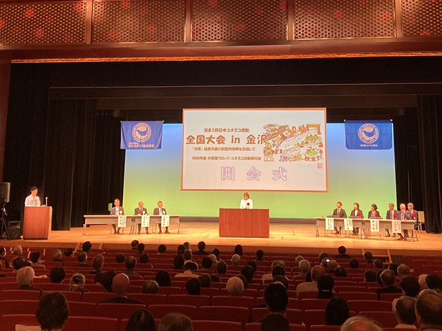 第81回日本ユネスコ運動全国大会が10月18日(土)に「『日常』能登半島の創造的復興を目指して」を大会テーマに金沢市で開催されました。会場の石川県立音楽堂邦楽ホールではオープニングイベントとしてキッズ・ジャズバンドBASICの演奏が参加者を出迎えてくれました。続いての開会式で日本ユネスコ連盟会長の佐藤美樹氏が「能登地域は昨年1月の地震、9月の豪雨で甚大な被害を受けました。全国からの支援もあり地域の多くの人達が助け合い、未来に向けて生活し活動を続けています。これはユネスコの理念でもある“持続可能な社会”とも共通するものがあります。本日はこのあとのパネルディスカッションを通じ、復旧・復興に向けての課題を共有して頂ければ幸いです」と挨拶しました。大会は「子どもたちによる伝統芸能の“能・狂言”」、「井上あずみ&ゆーゆの歌とお話コンサート」が行われ、休憩をはさんで『日常』能登半島の創造的復興をテーマにパネルディスカッションに移りました。